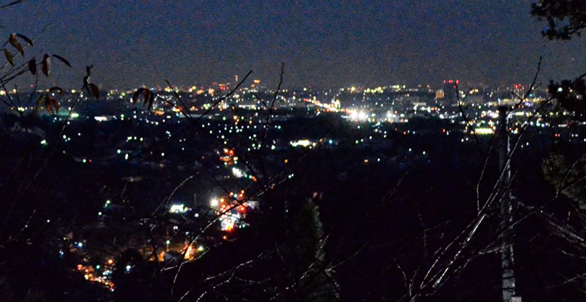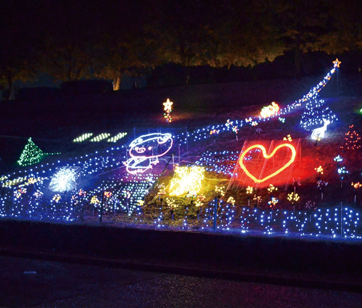 大型遊具や多目的広場など、子どもから大人まで多くの人の憩いの場となっている厚木市温水のぼうさいの丘公園。東側ヘリポート前の斜面では12月25日(日)まで、冬のイルミネーションを点灯している。
