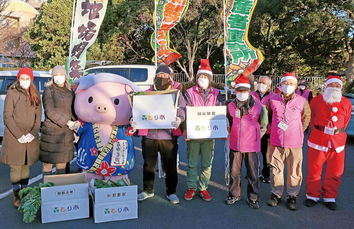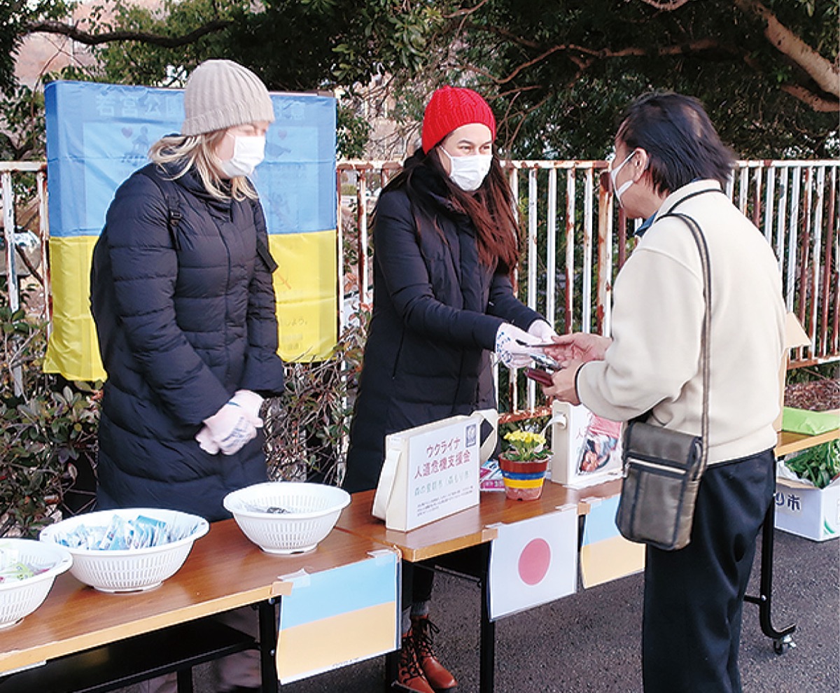厚木市森の里にある若宮公園西駐車場で昨年12月24日、地域有志による朝市「森もり市」が開催され、厚木市で受け入れているウクライナ避難民の2人が参加して募金活動が行われた。