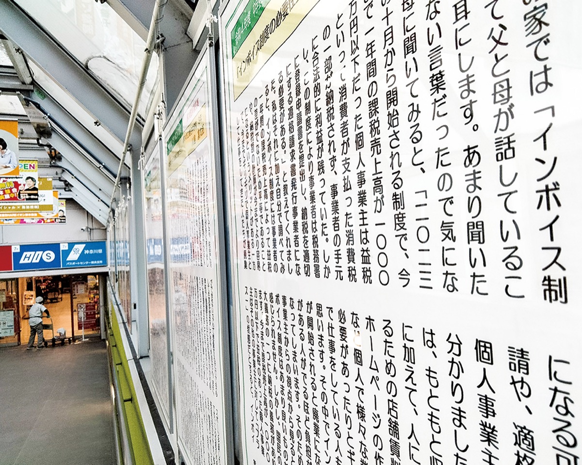 厚木税務署などによる「税の作品展」が12月に開催され、厚木ガーデンシティビルと立体駐車場をつなぐ空中歩廊に、税に関する作文や絵葉書、標語などが連なった。