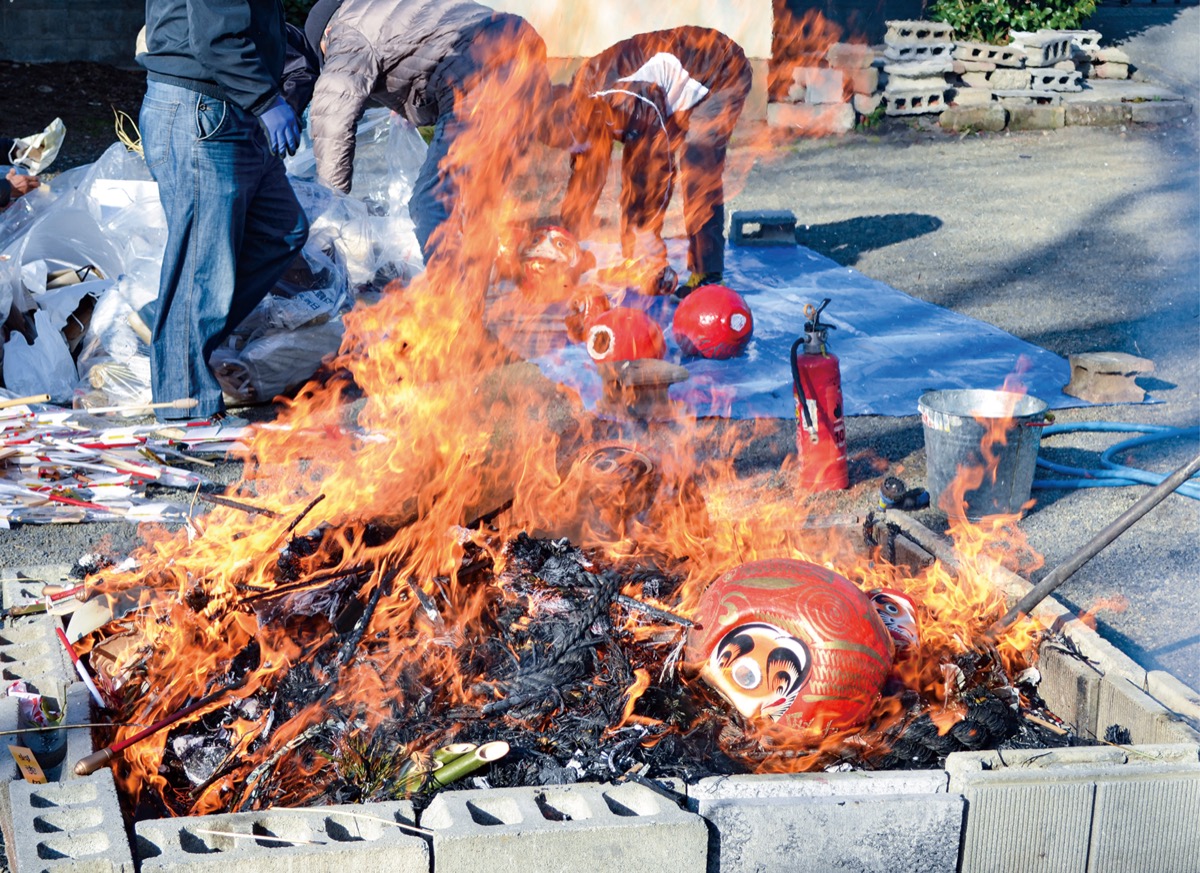 この日までに境内には、大量の正月飾りやお守り、だるまなどが持ち込まれ、会員らは火の用心に気を配りながら約1時間半ほどをかけて、すべて焼却した。