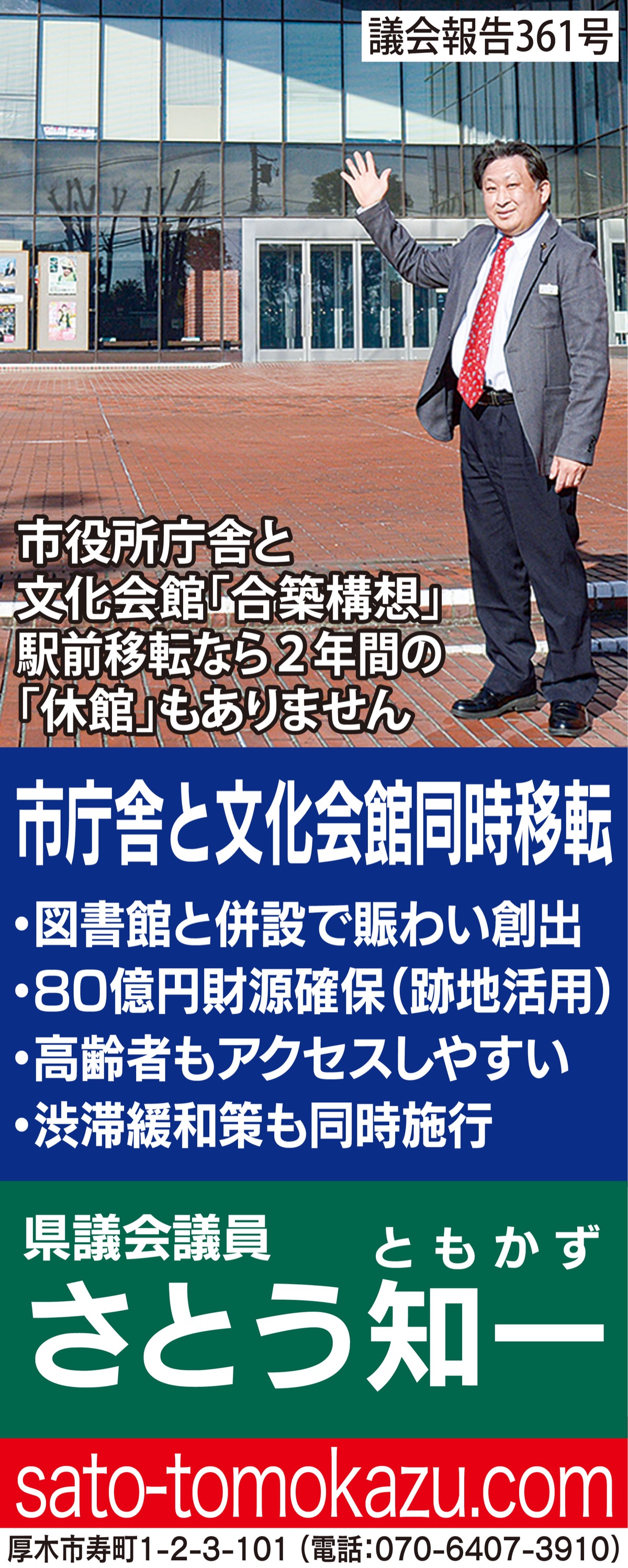 厚木市庁舎本厚木駅前移転に伴い県の9施設も複合施設に入居します。私は文化振興を所管する委員会に所属し質の高い文化の提供と賑わい創りに「力」を入れています。