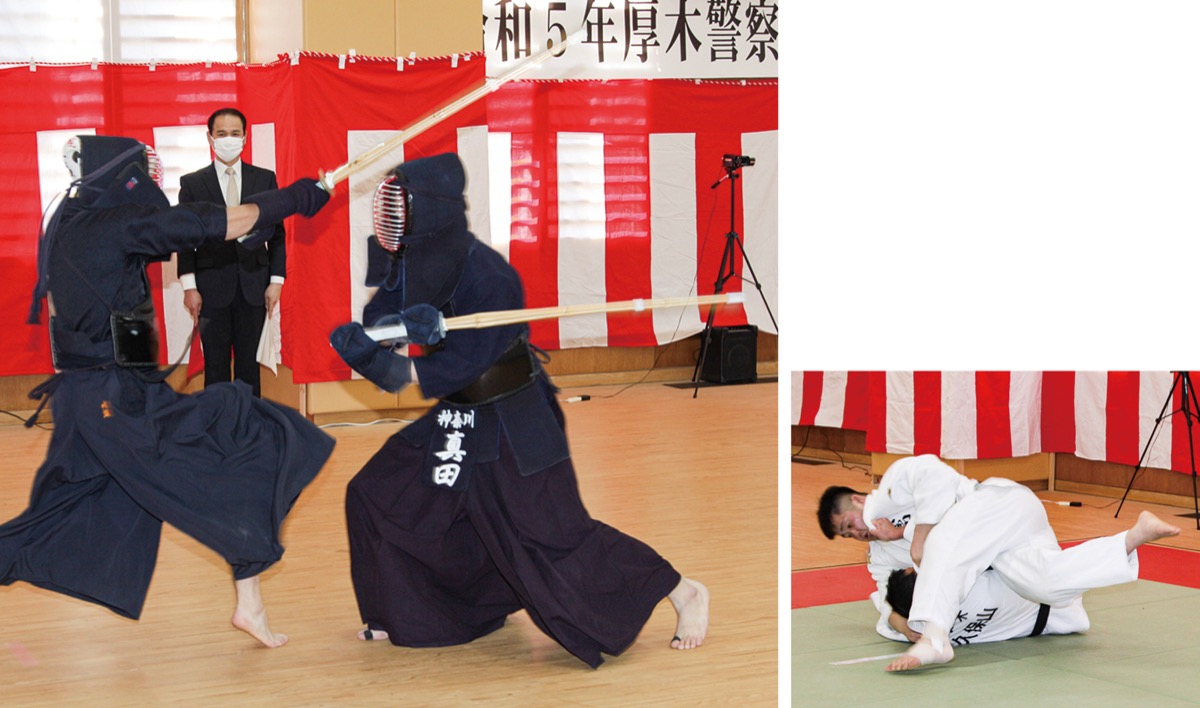 これは、地域の安全を守る警察署員が日頃の鍛錬の成果を披露する恒例行事。新型コロナウイルス感染症の影響で2年中止が続き、3年ぶりの開催となった。この日は、同署管内の小林常良厚木市長や小野澤豊愛川町長、岩澤吉美清川村長ほか来賓が出席。熱気ある署員たちの試合を見守った。柔道や剣道の試合では、腕に覚えのある実力者が出場。豪快な投げ技や、一瞬を制する鋭い打ち込みが決まると、会場からは大きな拍手があがった。この他にも、逮捕術試合や実戦的逮捕術も披露された。