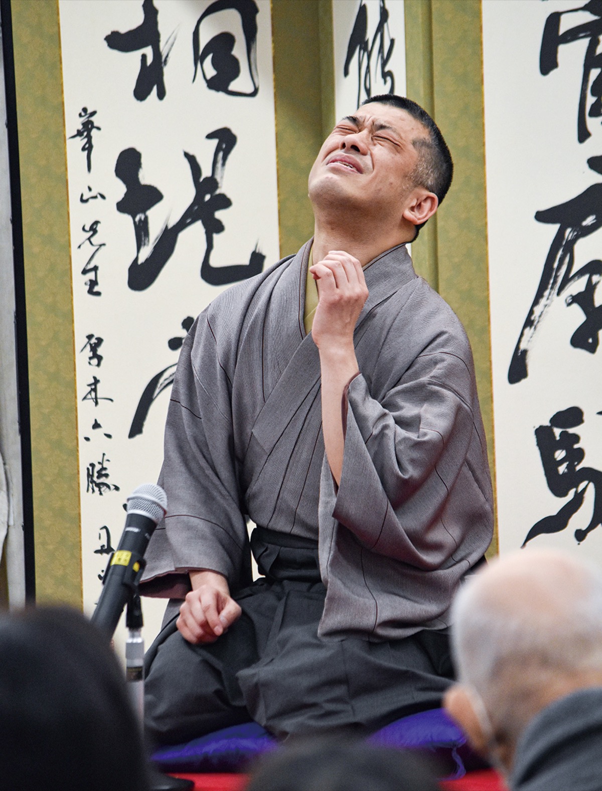 㐂三郎さんは昔を振り返り「私が厚木にいた頃はここはパルコだった」「海老名は田んぼしか...海老名の人いらっしゃいますかね」と客席を沸かせ、座布団から飛び出す勢いで観客を引き込み、江戸の世界にいざなった。落語会の時刻は正午を過ぎ、㐂三郎さんがズルズルと蕎麦をすする姿に、観客席からは「うまいね」「腹減った」と小声が漏れた。