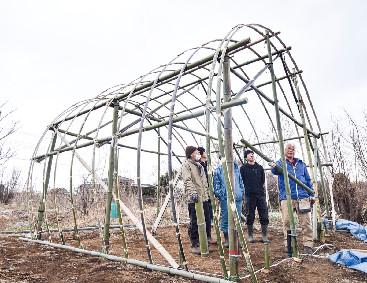 厚木では昨年秋から農場のメンバーが建設を開始。まずは整地して木の杭を打ち込み、梁や柱になる竹を組んだ後、割った竹をアーチ状に曲げて組み合わせた。大きな竹カゴのようにも見える半円形の構造で、今後ビニールをかぶせるなどして完成させる。