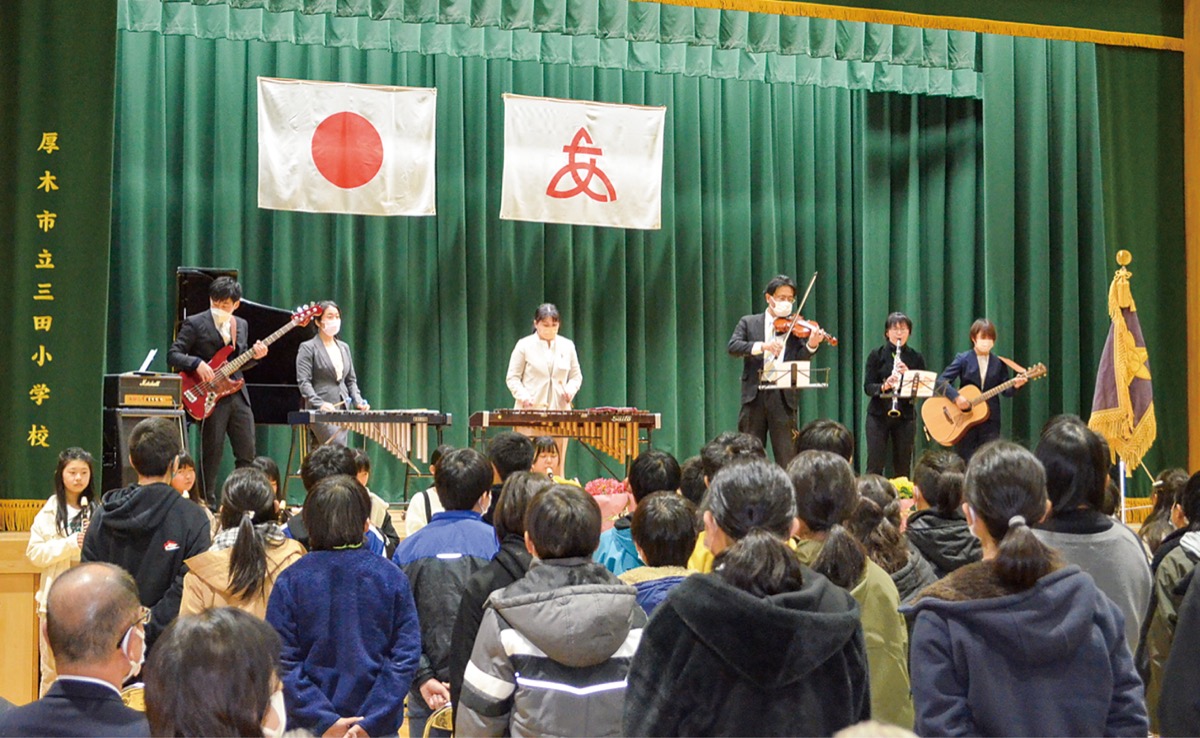 厚木市立三田小学校(田口真由美校長・児童数726人)が50周年を迎え2月9日、記念式典が盛大に開催された。式典では、ドローン映像の上映のほか、児童が作詞、校長が作曲した記念ソングを職員バンドと児童代表が演奏。6年生が歌い祝った。