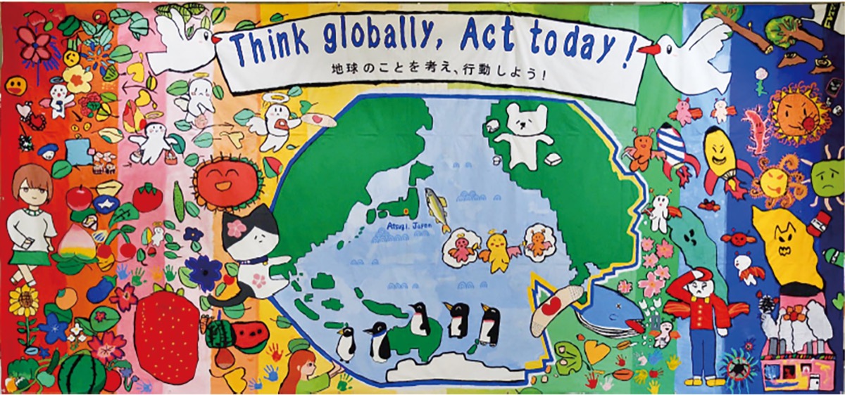 昨年夏、市内でウクライナの子どもの作品を展示した事をきっかけに、厚木っ子も半年をかけて描いた。横幅7・8mの作品テーマは地球環境。中央に傷つく地球、野菜や花、海洋のプラごみや森林伐採などの諸問題が描かれている。