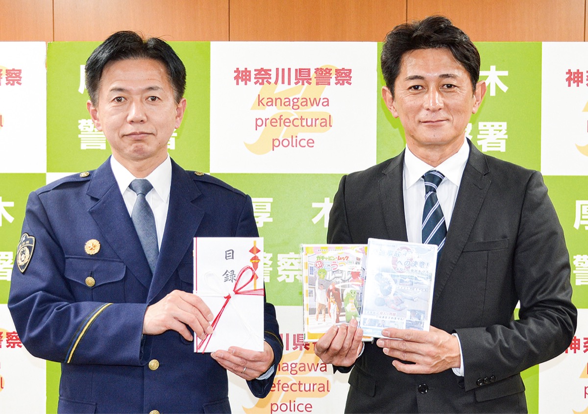 厚木警察署管内安全運転管理者会(真田辰雄会長)が3月16日、厚木警察署(有原馨署長)に交通安全を呼びかける懸垂幕2本と交通安全教育のDVD2枚を寄贈した。