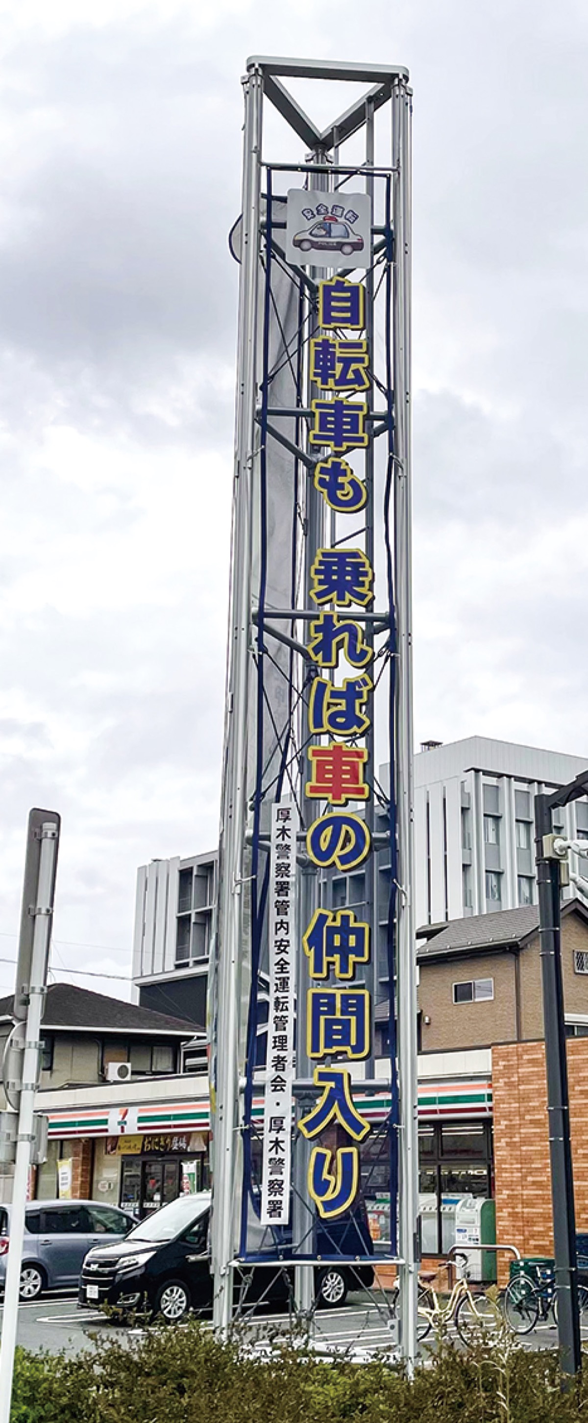 真田会長は「新型コロナの5類移行などもあり、これからは様々な交通安全の活動も増えてくるので、お役に立てていただけたら」と話した。有原署長は「大きな懸垂幕を作っていただき、ありがとうございます。効果的に交通安全のメッセージを発信していけたら」と話す。