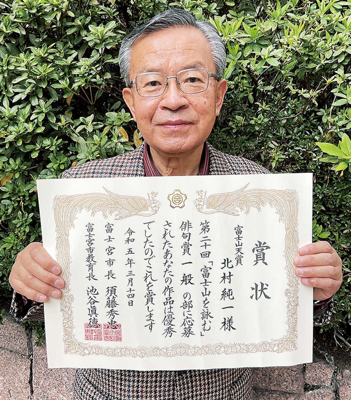 厚木市在住の北村純一さん(78)の俳句がこのほど、作品展「第20回富士山を詠む」(静岡県富士宮市・富士宮市教育委員会共催)の一般部門で最高賞「富士山天賞」を受賞した。同賞の受賞は初めて。
