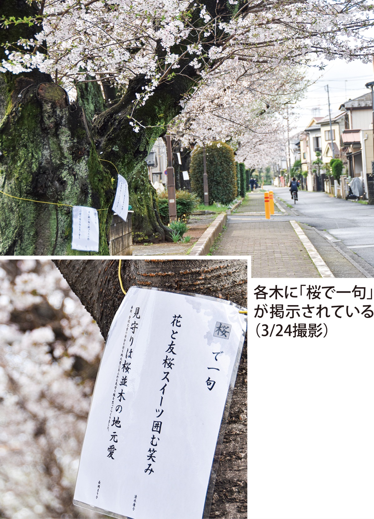厚木市妻田東1丁目付近の遊歩道に植えられている50本以上の桜の木が満開を迎え、現在、各木に桜にちなんだ俳句を掲示。道行く人をさらに楽しませている。