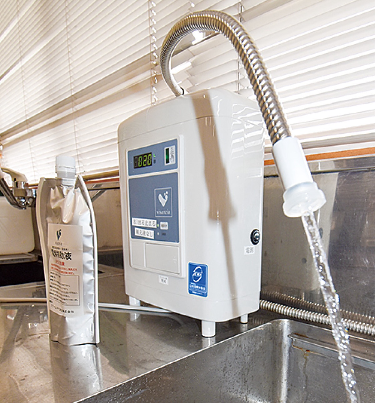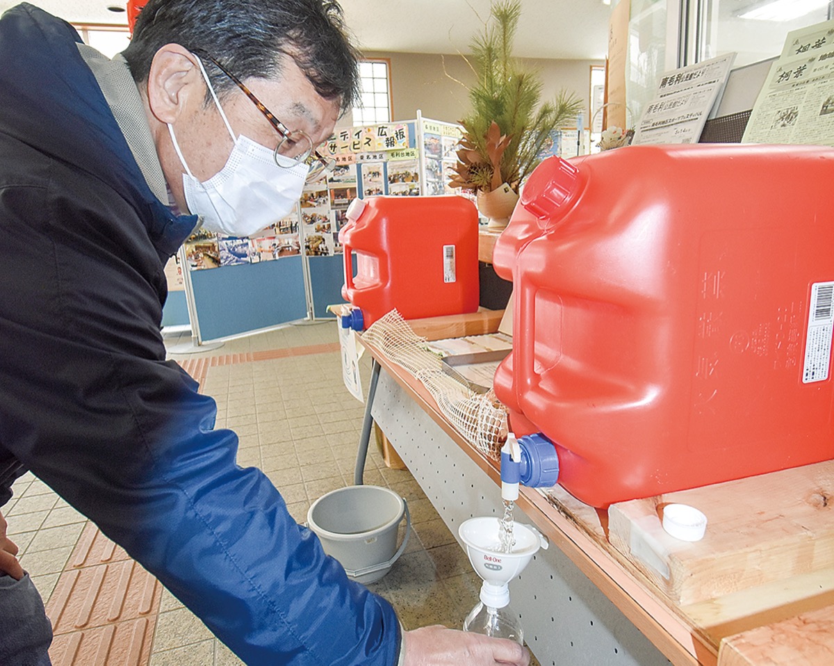 次亜塩素酸水の生成機材は3年前から介護用品関連の企業・プライムケア東京(株)(海老名市)が市に無償貸与しているもの。水道をつなぎ薬剤を入れ、スイッチを押すだけで次亜塩素酸水が出る。市内6公民館を拠点に生成し、別の館にタンクで運んでいた。