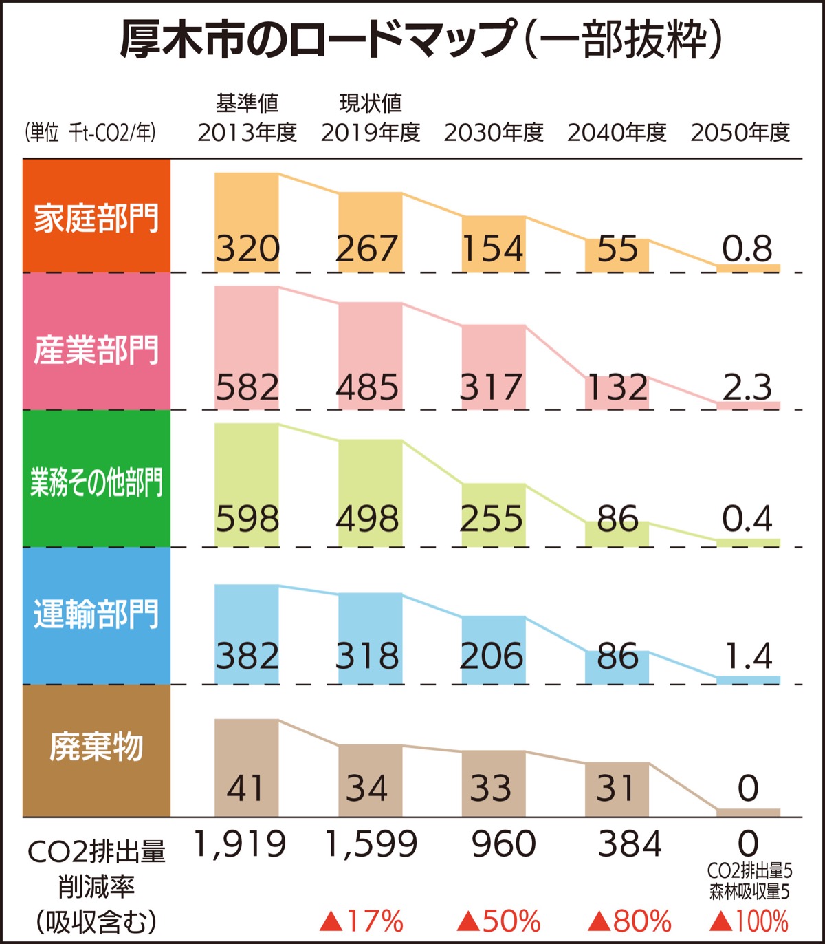 厚木市が3月28日、2050年のカーボンニュートラルへの道筋を示す「厚木市カーボンニュートラルロードマップ」を発表した。厚木市で排出されているCO2の量や段階的な削減目標、家庭や事業所で可能な取り組みなどを掲載している。