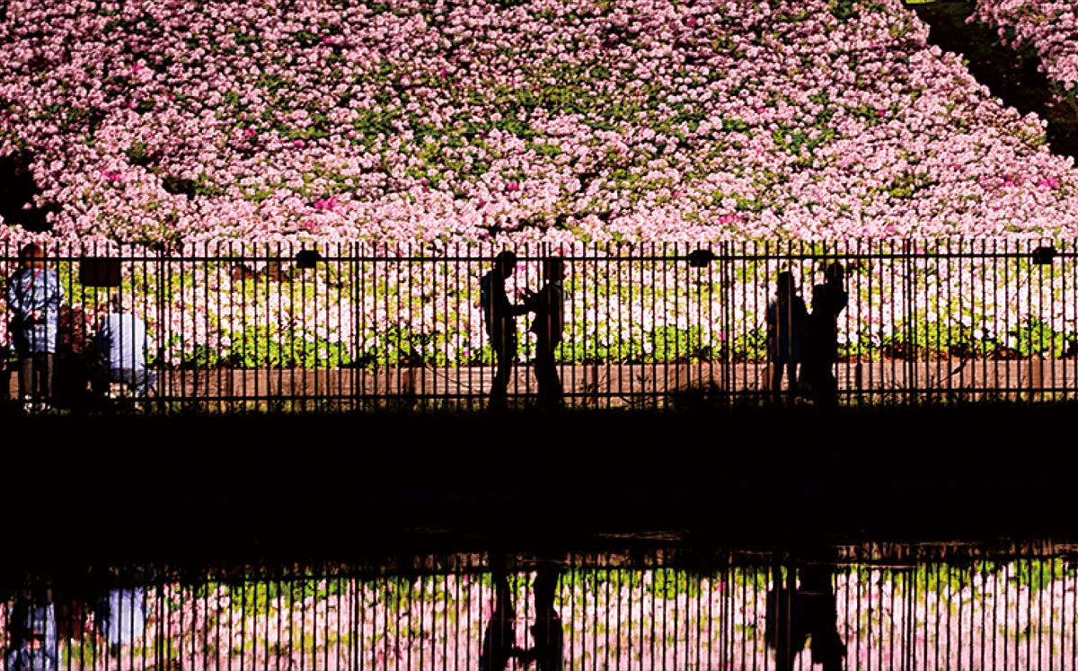 約5万2千本のツツジが開花する同公園。4月中旬から早咲きの品種が咲きはじめ、取材に訪れた4月17日には真っ赤なキリシマツツジとなじみ深いオオムラサキの大輪が咲き揃い、新緑のなか甘い芳香が漂っていた。