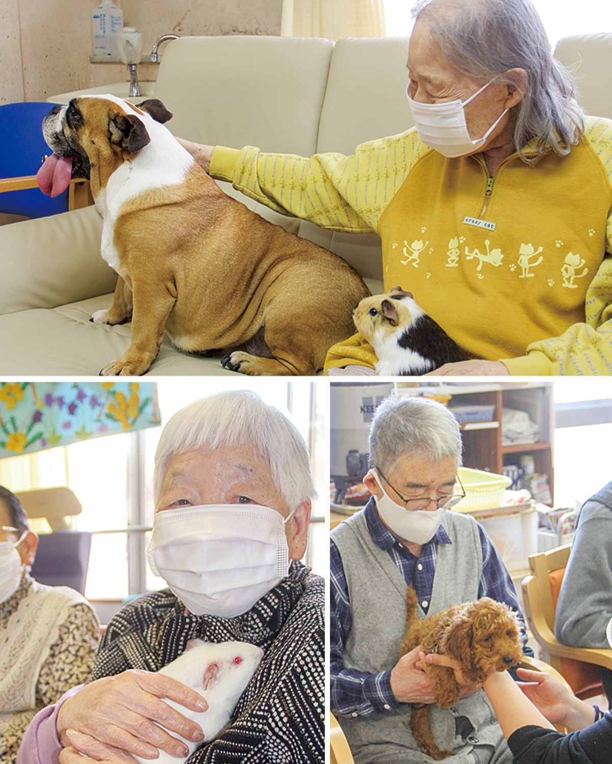 同所での移動動物園は昨年に引き続き2回目。この日は犬8匹をはじめ、メンフクロウやモルモット、リクガメなどが登場し、施設利用者と触れ合った。参加した臼井米子さん(90)は、「動物を触る機会も少なく、とっても癒されました。嬉しい」と笑顔。また当日は同法人のみらくる保育園(飯山南)の園児たちも訪れ、動物園を楽しんだ。