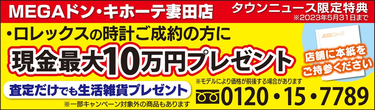 国道246号線沿いにある「ドン・キホーテOUTLET館」2階の買取専門店「おたからやMEGAドン・キホーテ妻田店」では現在、腕時計・ロレックスの買取を強化中。買取成約で買取金額と別に最大で現金10万円を進呈している。スタッフは「動かなくなってしまった、ガラスが割れてしまった時計でも問題ありません。この機会にぜひご相談ください」と話す。