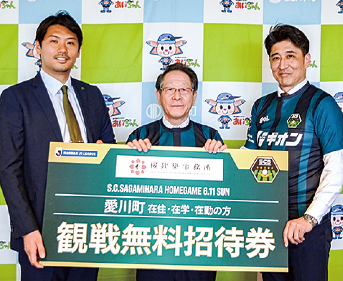 4月28日、町役場で行われたチケットの寄贈式には、小野澤豊町長、SC相模原の西谷義久社長、(株)桜建築事務所の熊坂利幸代表取締役らが出席した。西谷社長は「6月11日は良いプレーを見せたい」、熊坂代表取締役は「スポーツ文化の取り組みに寄与することができてうれしい」と話した。小野澤町長は「J2を目指しがんばってください。私たちも応援します」とエールを送った。