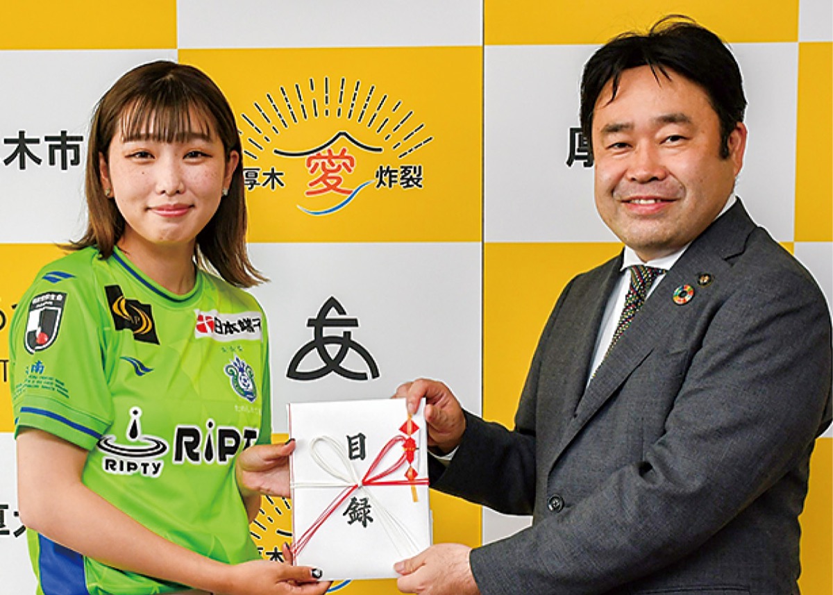小柴学部長は「これからも地域貢献のために地元市町村にチケットをお渡しし、一緒にベルマーレを応援したい」とコメント。山口市長は「チケットを頂き感謝します。厚木はホームタウンということで、市民にもチームを誇りに思ってもらえるよう、市としてもスポーツ政策に力をいれていきたい」と話した。
