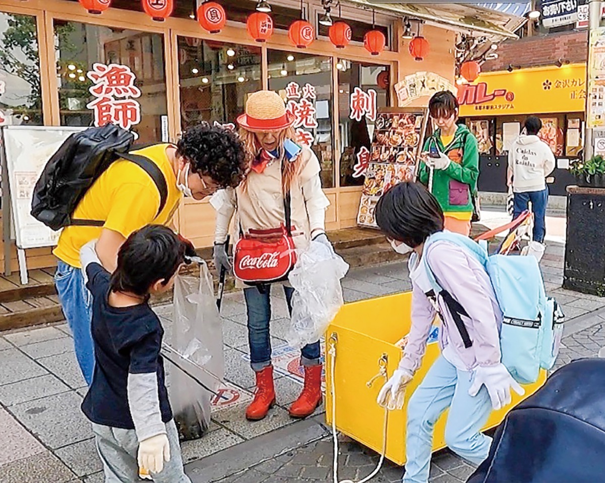 戸室在住のシンガーソングライター・上野友輝くさんが中心となって開いたイベントで、集まったのは8歳から80歳代までの10人ほど。埼玉県から訪れた参加者もいた。駅前周辺の商店街でゴミを拾い集め、市の許可を得て排水溝も開いた。中にはドロドロになった吸殻がたまっており、袋がすぐに一杯になった。