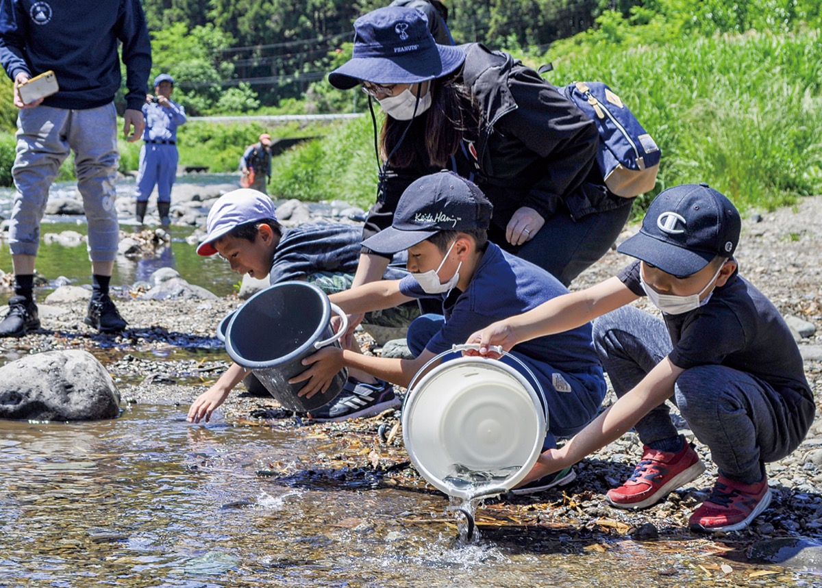 愛川町立半原小学校と田代小学校の3年生児童が5月24日、中津川で稚鮎の放流を行った。児童に町の自然や文化を認識する機会にしてもらうことが目的で、毎年この時期に行っている。町商工観光課と中津川漁業協同組合(木藤照雄組合長)の協力。