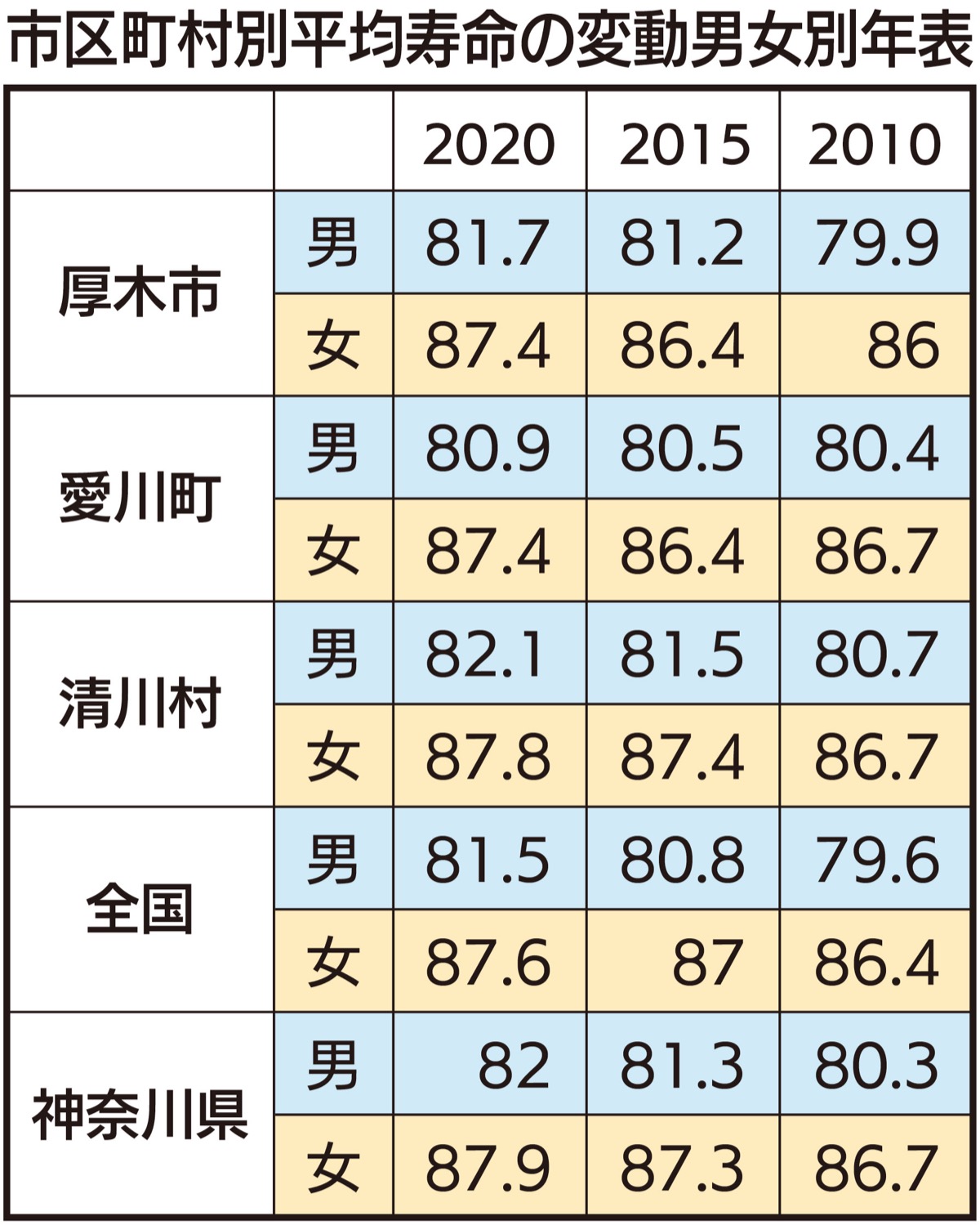 厚生労働省が5月12日に2020年の市区町村別の平均寿命を公表した。厚木市は男性81・7歳/女性87・4歳、愛川町は男性80・9歳/女性87・4歳、清川村は男性82・1歳/女性87・8歳で全地域で前回調査の2015年からわずかに伸びた。高齢化を受け、全国的に「健康長寿」への取り組みが広がる中、3市町村とも力を入れるのは「住民の日々の暮らしの中の健康意識向上」という。