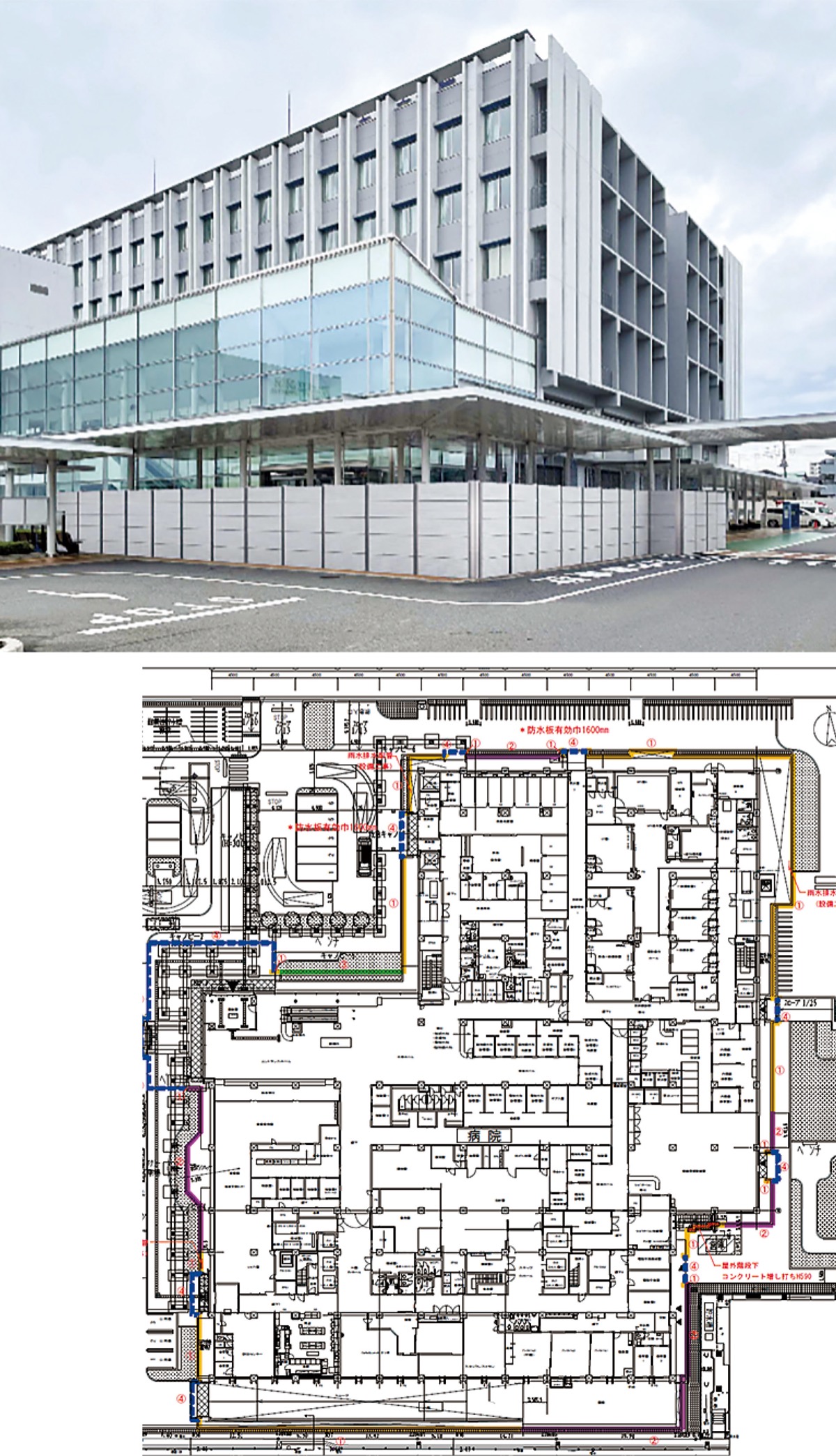 整備内容は、病院棟を囲む既存のコンクリート擁壁は約70cmをかさ上げするとともに補強。正面入り口など9カ所の開口部へは、脱着式防水板を新たに設置する。また、病院棟の外にある排水処理棟などは、分電盤を移設し防水扉を設ける。