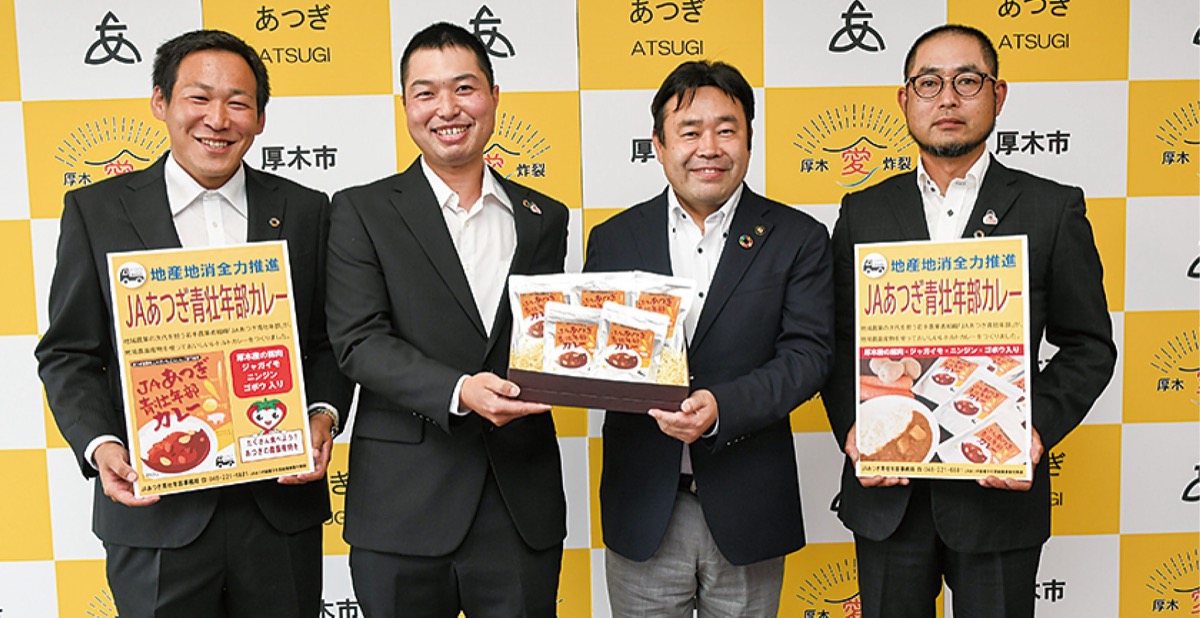 厚木市農業協同組合青壮年部の鈴木貴部長を含む部員3人が5月29日、厚木産の肉や野菜を使ったレトルトカレー「JAあつぎ青壮年部カレー」の商品化を山口貴裕市長に報告した。