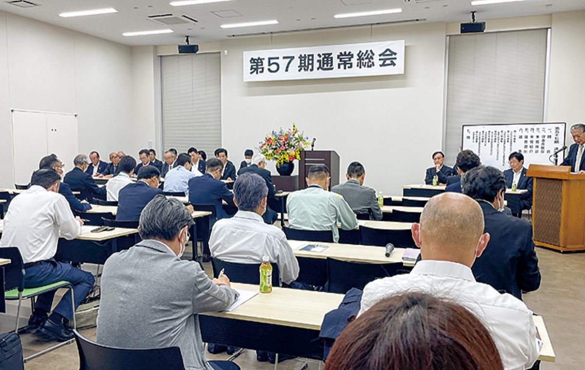 14日に、開館が完成して初となる総会が、同館大ホールで行われた。歳原理事長は団地の歴史や、コロナ禍・脱炭素化など近年の地域経済圏を取り巻く社会の変化などに触れながらあいさつ。会員企業や関係者への感謝を述べながら「これからも地域経済発展の礎に」と期待を込めた。