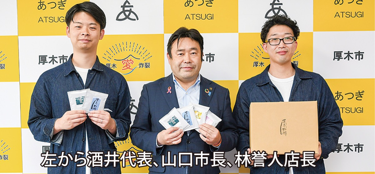 合同会社厚木珈琲は6月12日、厚木市役所を訪れ、山口貴裕市長にドリップバッグコーヒー200個を手渡した。