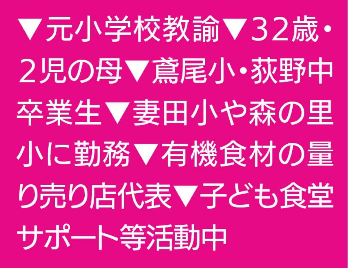 私たちの声を届けてやさしい社会に変えていくにはどうしたらよいのかと考える日々の中、同じように子育てをしながら活動している政治家の人たちと出会い、自分たちの生活と社会全体の意思決定をする場がつながっていることを知りました。そして、子どもたちが安心して暮らせる未来を残したい。支え合う社会を作っていきたい。と思うようになりました。すでに厚木市では子どもの医療費助成やおむつの支給などが行われていますが、母親たちが孤独や大きな負担を感じずに子育てできるようにするためには「地域全体で子どもたちを育てる」視点が大切なのではないでしょうか。