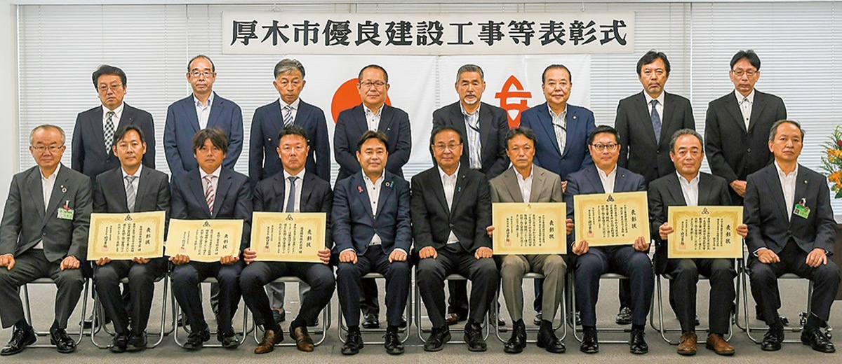 【優良表彰※代表者名は敬称略】▽令和元年度公共下水道厚木排水区雨水貯留管整備工事(継続)/戸田・小島・関野特別共同企業体/構成員代表者 戸田建設(株) 横浜支店(横浜市西区・縄田浩)▽七沢自然ふれあいセンター法面復旧工事/西進開発(株)(厚木市温水・小山内綾)▽市道妻田中荻野線舗装補修工事/東翔工業(有)(飯山南・本杉太希男)▽睦合中学校南棟校舎外壁改修(衛生)工事/(有)原設備工業( 及川・原英介)