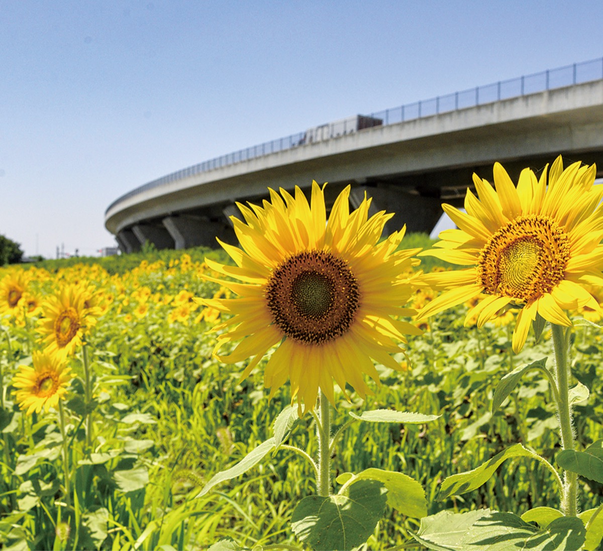 新相模大橋北側にあるフラワーパーク下依知(厚木市下依知668の2周辺)のひまわり畑が見頃を迎えた。管理をするのはフラワーパーク下依知実行委員会(片倉正晶会長)。河川の環境美化活動の一環として、約20年前から取り組まれる。整備には地域住民ら約30人が携わる。片倉会長は「5月の連休明けに種を撒いた。見頃は今週いっぱいだと思う」と話した。