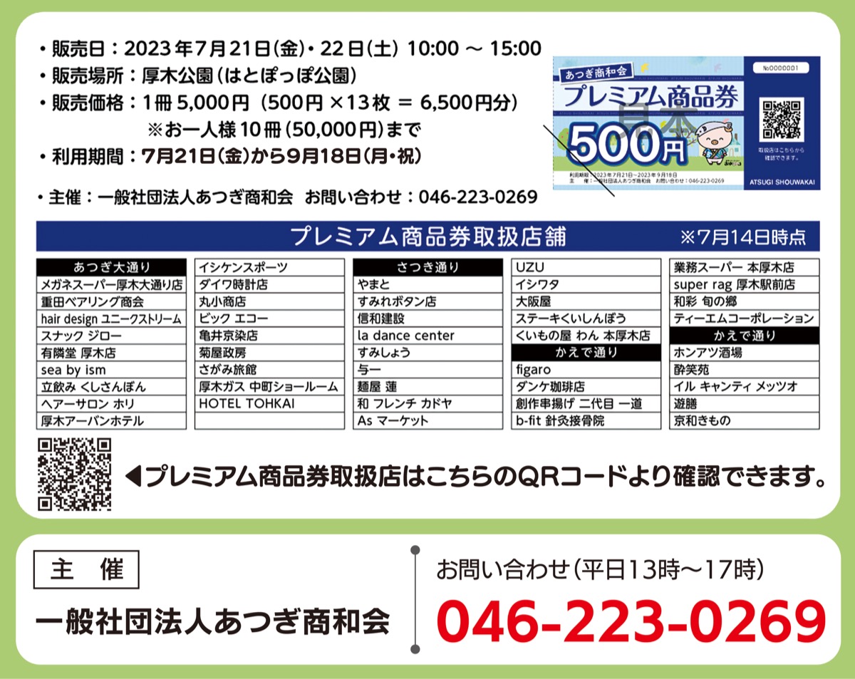 1冊の内訳は、500円券が13枚。5つの商店会(あつぎ大通り・さつき通り・かえで通り・もみじ通り)に所属する店舗45店(7月14日時点)で使用できる。