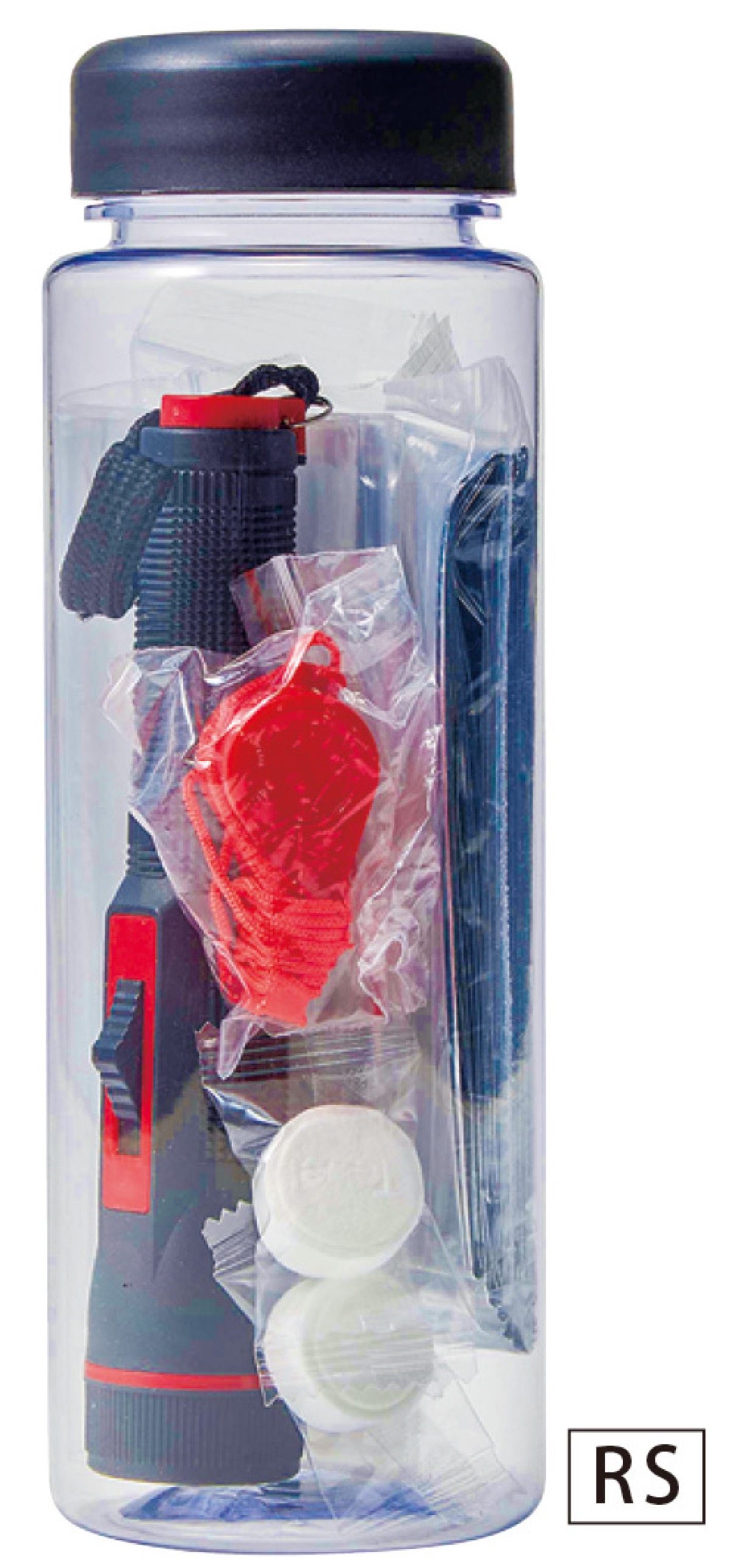 中身は【1】水などを入れられるフタ付ボトル【2】自分の位置を知らせるホイッスル【3】光を灯すLEDライト【4】わずかペットボトルキャップ1杯分の水で元のサイズに戻る圧縮タオル【5】体温保持を助ける大判サイズのアルミシート【6】携帯電話を保護したり、仕分けに便利なジッパーバッグの6点。