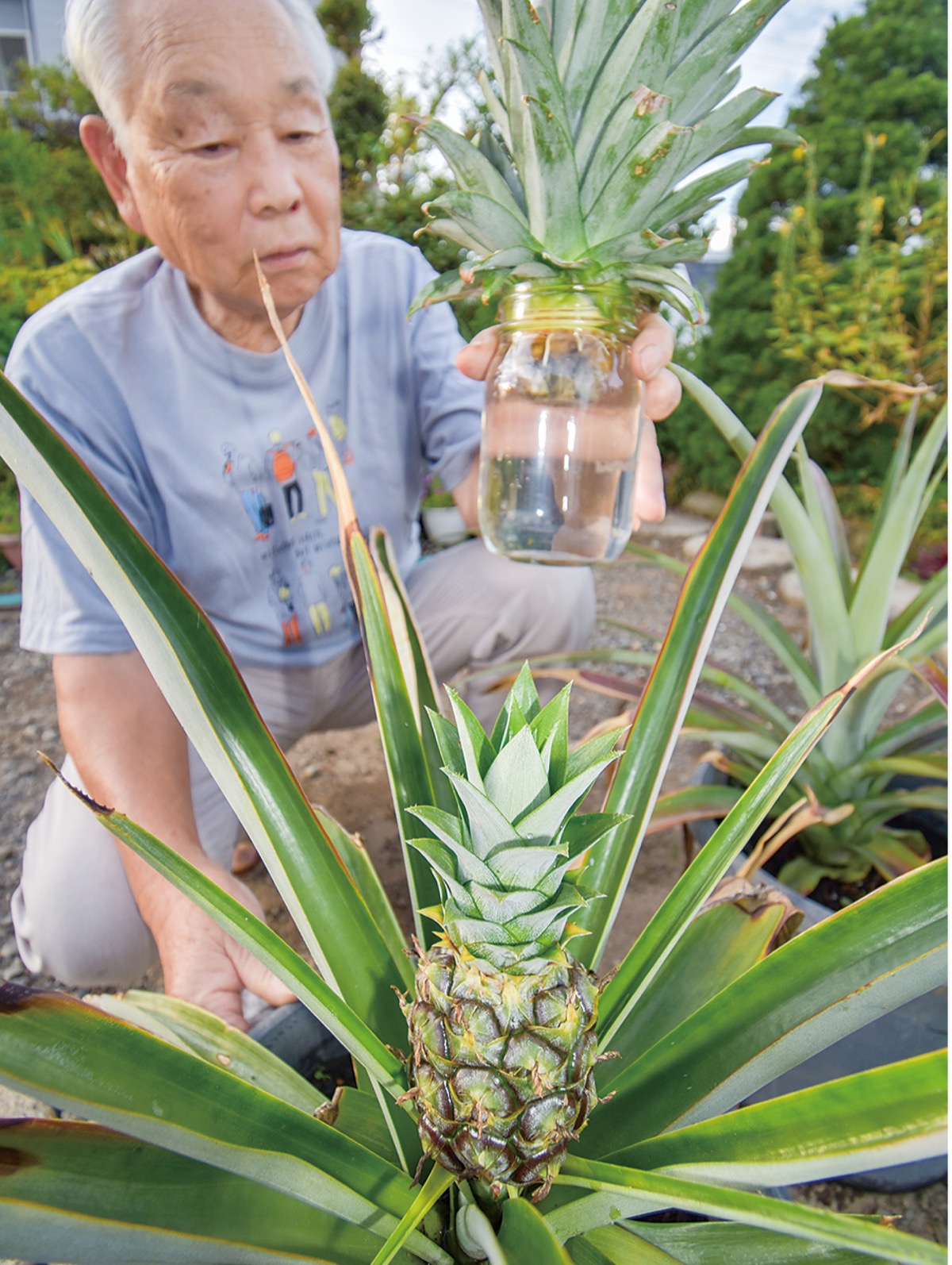 果たして猛暑の産物か――愛川町田代の加藤強さん(79)宅の庭で、小さなパイナップルが育っている。