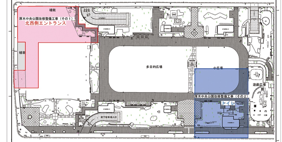 厚木中央公園が今年9月上旬から2025年にかけ、より魅力的な公園づくりを目指し、初の大規模リニューアル工事を行う。今年度はトイレと北西側エントランスを改修、来年度は現在閉鎖中の「憩いの広場」が芝生広場へ生まれ変わる。