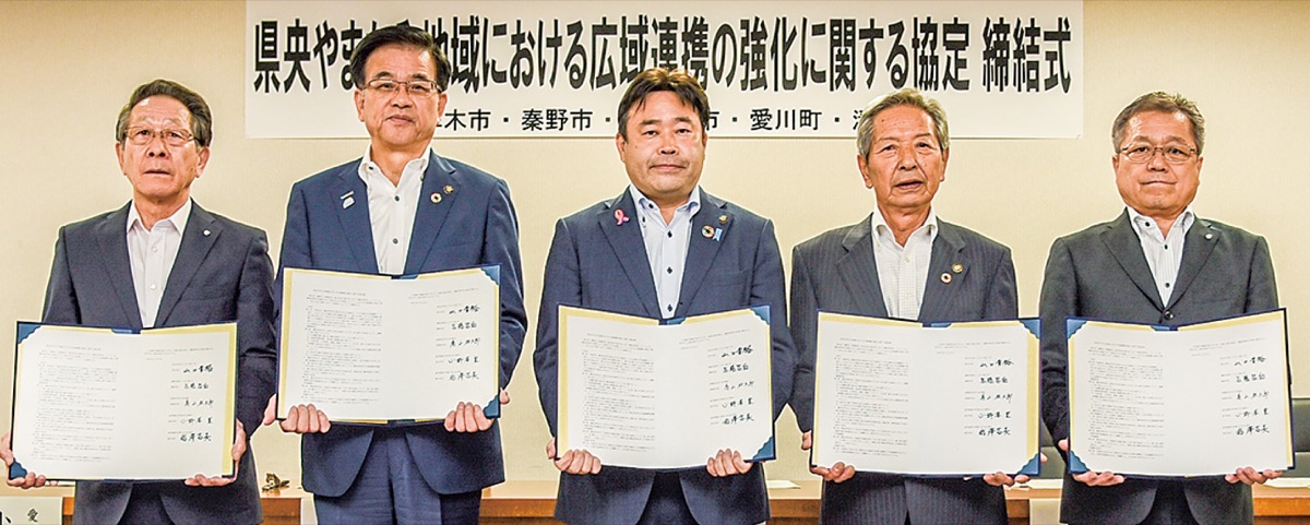 近年、少子高齢化や人口減少社会が進展し、都市間競争が激しさを増す中において、質の高い行政サービスを安定して提供し続け、住民の皆様が地域に誇りと愛着をもって暮らしていただけるためには、私たち基礎自治体が都市間競争ではなく、「都市間協調」を図り、市町村の枠を超えた広域エリアによる競争力を高めていく必要があると考えています。そうした中、古くから交流のある秦野市、伊勢原市、愛川町、清川村と、令和5年度から連携強化に向けた協議を進め、7月18日に協定の締結に至ったことは、大変喜ばしいことと考えています。また、協定の締結はこの5市町村が一体となって地域づくりに取り組んでいこうという思いを共有し、その意思を示すためのもので大変意義のあるものだと考えています。