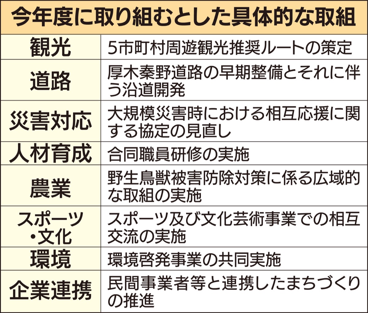 市長就任以来、私の公約である「県央姉妹都市構想」を厚木市の取組として掲げ、近隣市町村との広域連携の推進を重要施策の一つとして取り組む中、秦野市、伊勢原市、愛川町、清川村と、丹沢・大山を軸とした連携強化に向けた協議を進め、本年7月18日に広域連携の強化に関する協定の締結に至ったものです。厚木市が進める「県央姉妹都市構想」の取組と、5市町村の協定に基づく取組については、いずれも「都市間協調」の視点から地域全体の活性化を図り、将来にわたり発展し続け、魅力あふれる地域社会の創造を目指すものであり、目指す方向性や目的は同一であると認識しています。