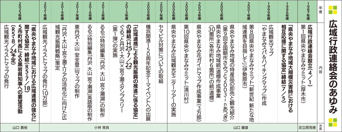 協定に関わる5市町村の取組として、まずは、丹沢・大山・七沢・飯山・宮ケ瀬湖などを軸とした観光振興をはじめ、県道・地域高規格道路の整備促進にしっかりと取り組み、魅力あるエリア、強いエリアを目指していきます。