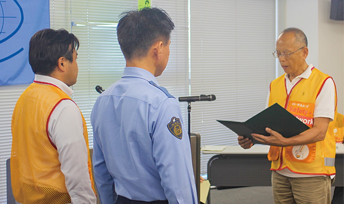 指定式で山口市長は「日頃の地域活動に感謝。引き続き、地域をよく知る皆さまの経験と知恵を活かし、安心安全なまちづくりに向けた力添えを頂きたい」とあいさつ。有原馨厚木警察署長は「市内では空き巣、自転車盗、特殊詐欺、交通事故が増加傾向にある。犯罪や事故を未然に防ぐためには、日常と違う点に気づくことが重要」と話した。また推進地区を代表して相川地区の片岡俊治さんは「犯罪防止や交通安全、けが防止など、セーフコミュニティの取り組みを充実させ、身近な安心安全活動を積極的に行いたい」と山口市長と有原署長に誓った=写真下。