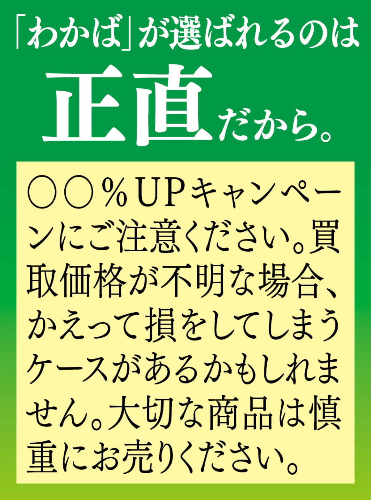 厚木トレリス3階の「買取店わかば」では9月9日まで、洋酒の買取強化を実施している。決まった賞味期限はないので、ヘネシーレミーマルタンをはじめドンペリカミュ、国産ウイスキー山崎、響など未開封であれば高価で買取ってくれる。「置いておくだけではもったいないです」と呼びかけている。その他にも、貴金属や時計、ブランド品も高価買取中。