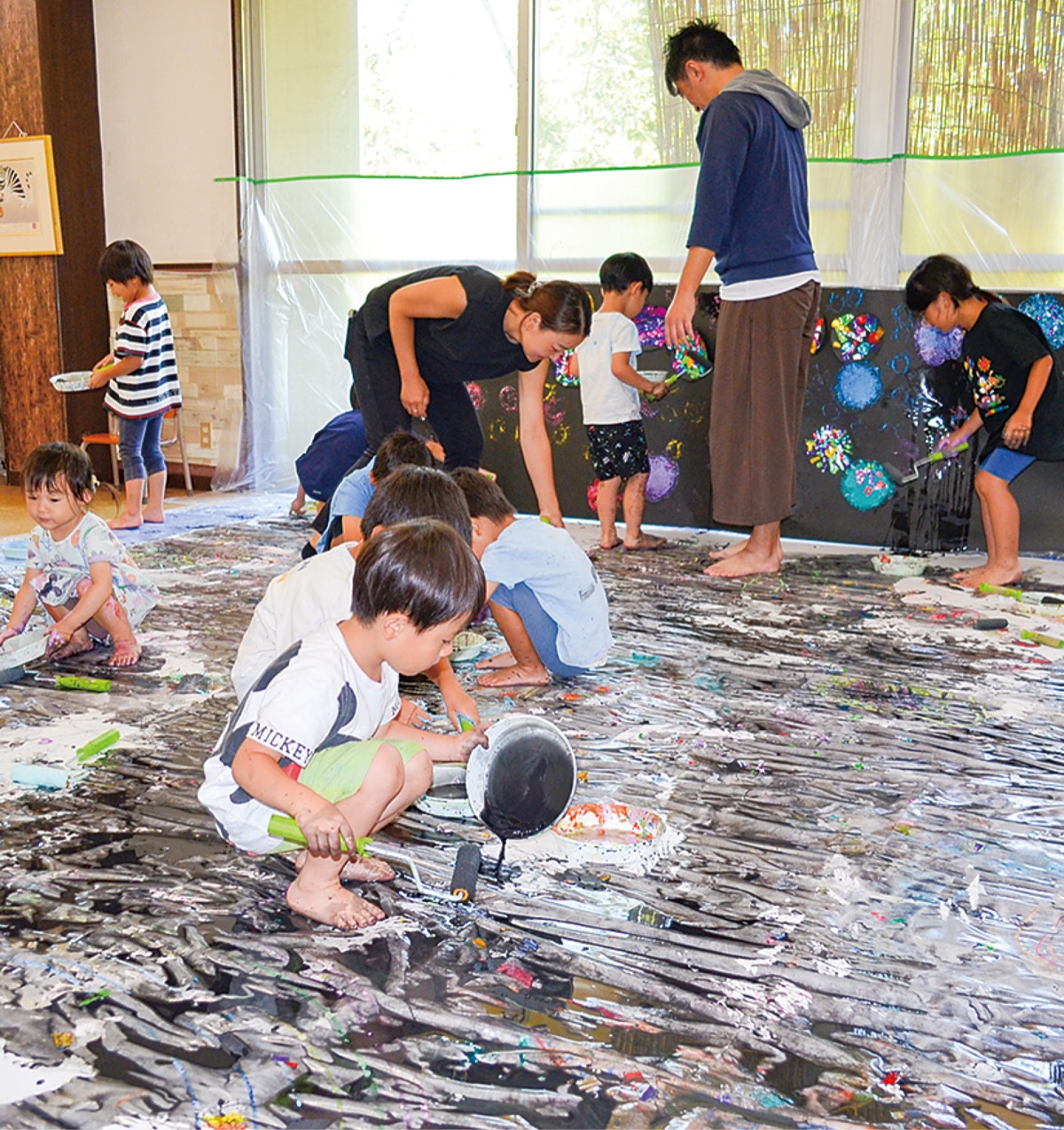 この日のテーマは花火。園児らは色紙や紙コップなどを使い思い思いの花火を描いた。最初は遠慮がちだった園児らも、時間の経過とともに全身絵の具だらけになりながら創作した。