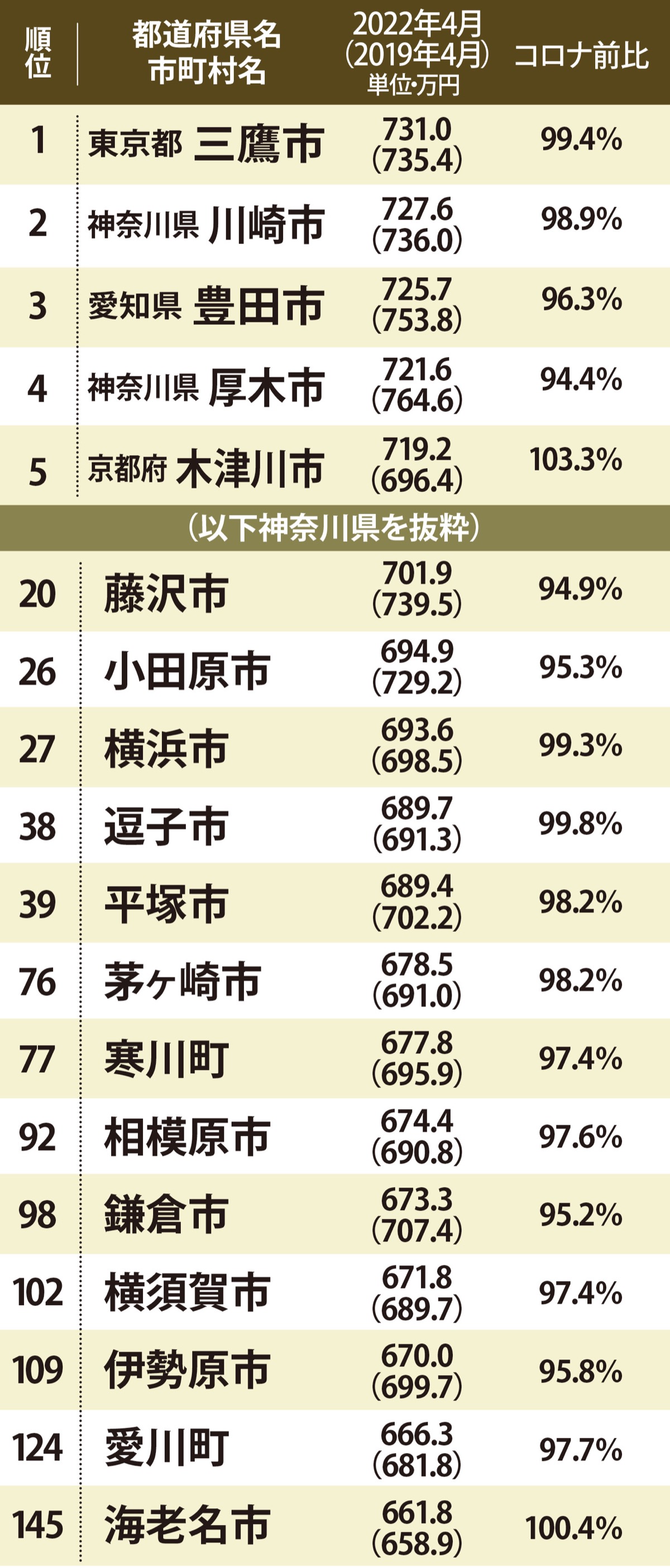 自治体ごとの公務員の平均年収を、東洋経済オンラインが7月末にランキングとして上位300地域を発表。厚木市はコロナ前2019年時点では764・6万円で全国1位だったが、コロナ前比94・4%で721・6万円となり、全国4位になった。