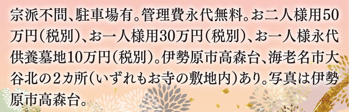 「ゆかりえ」では伊勢原市高森台と海老名市大谷北のお寺の一角に、直営の「樹木葬霊園」を用意。いずれも、シンボルツリーを植える木の下ではなくガーデン式の樹木葬で、跡継ぎを必要としない永代供養の霊園スタイルで、単身や夫婦、2世代でも利用できるよう柔軟に運営している。