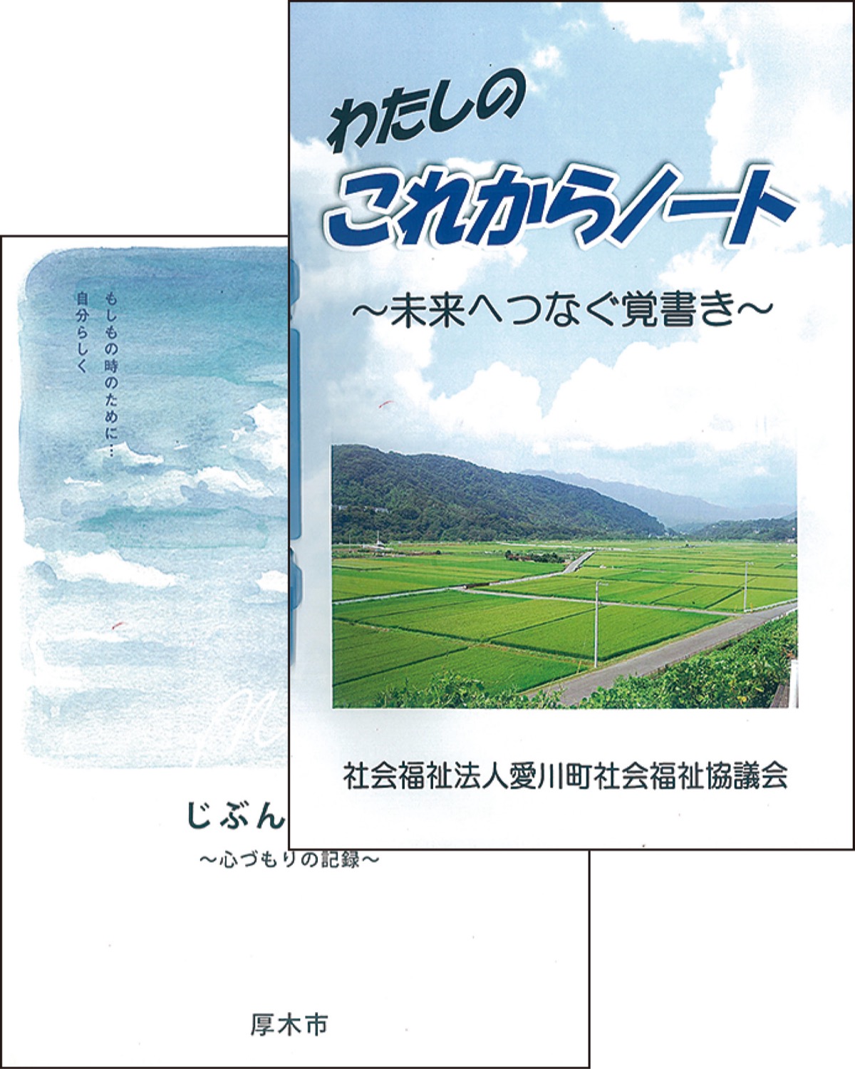 愛川町社会福祉協議会が出しているのは「わたしのこれからノート〜未来へつなぐ覚書き」。同様に自分の経歴やこれからの事、夢中になっている事などを考え、書き込める構成だ。同会は「気持ちや考えは変わるもの。書き直しても良い、大切な方に話すことも忘れずに」と話している。
