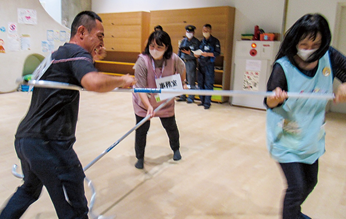 当日は「刃物を隠し持った男が突然施設内に侵入」「大声を発して施設内に侵入する男」「様子を窺っている人物」を想定。職員は声を掛け合い利用者に避難を促しながら、さすまたを使い不審者の侵入を阻止する訓練に取り組んだ。