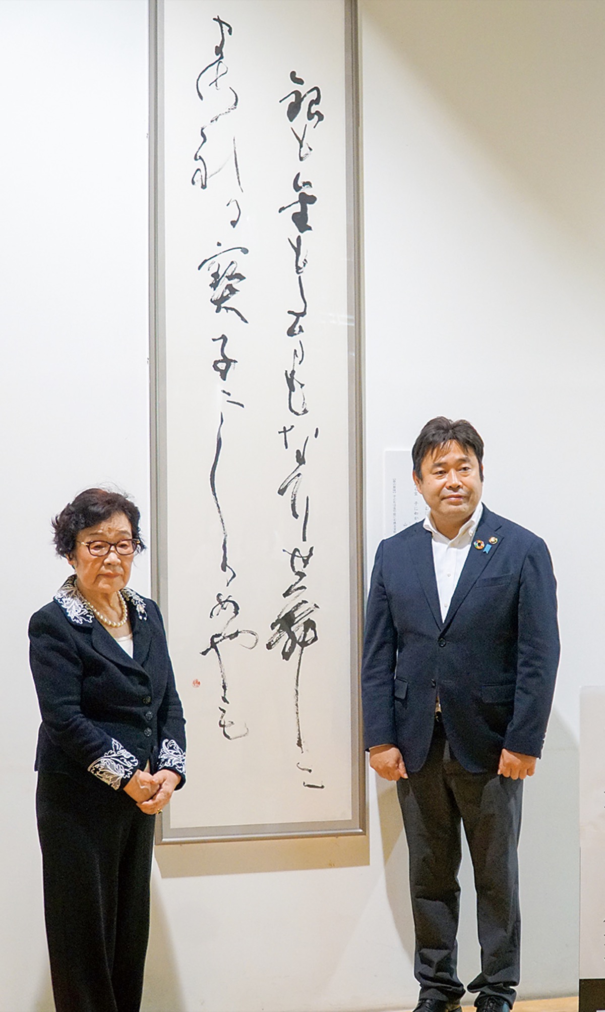 厚木市在住の書道家、八木梢葉(しょうよう)(本名・八木千代子・85)さんが8月24日、アミューあつぎで山口貴裕市長に書を寄贈した。これは山口市長が7月に、同施設の5階にある「あつぎアートギャラリー」で開いた八木さんんの個展に訪れた際に今回、寄贈した書に感銘を受けたことがきっかけ。