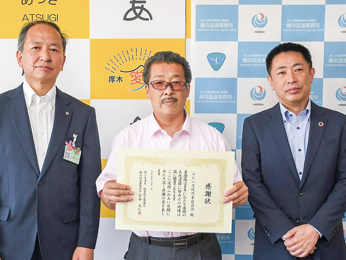 厚木市恩名の「みらい文化川本自治会」(安藤敏行自治会長)は8月21日、これまでの道路愛護活動の功績が評価され、国土交通省から横浜国道事務所長表彰が贈られた。