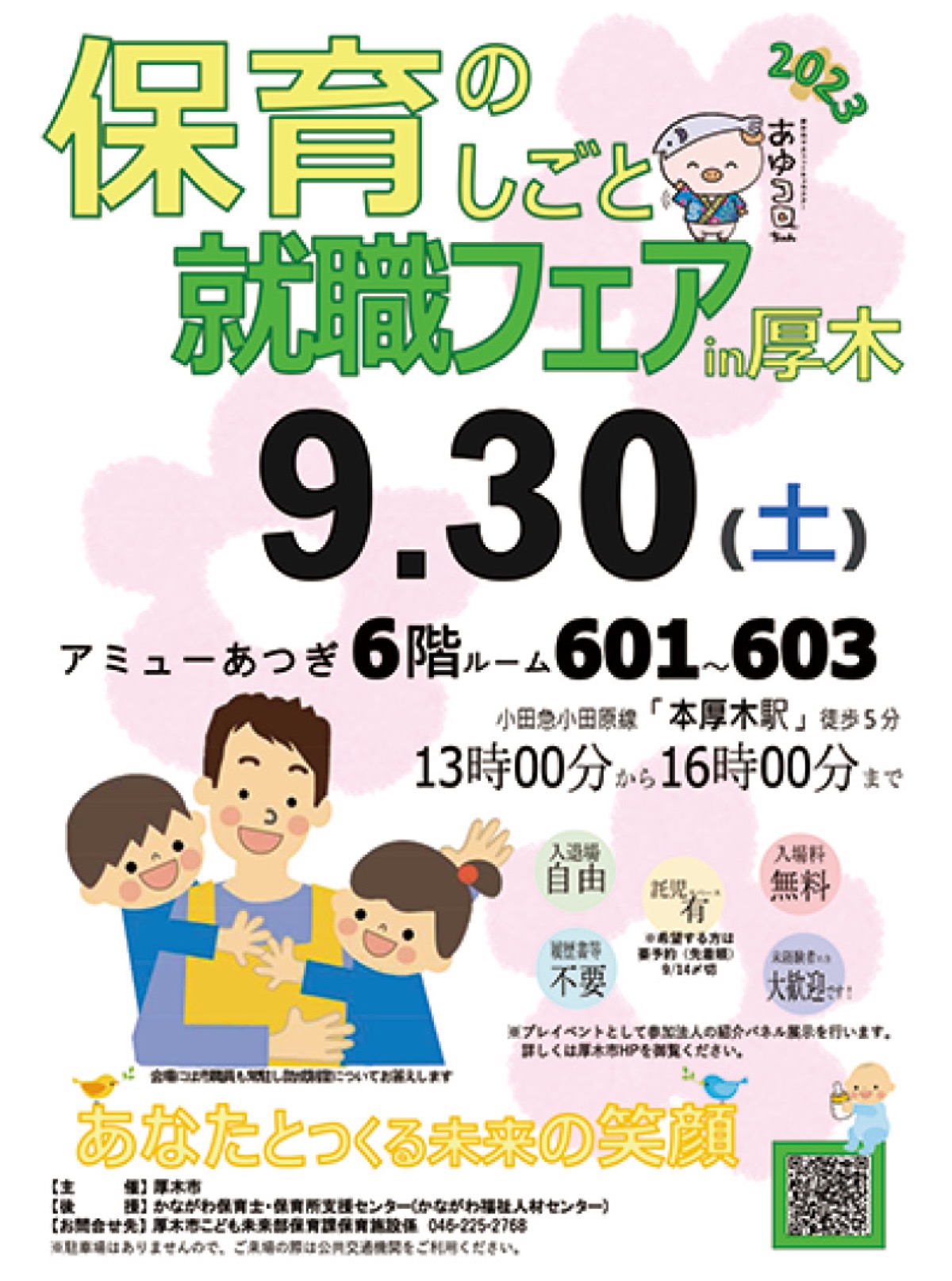 保育の仕事は未来を育てる仕事--。厚木市は市内で働く保育士の支援に力を入れている。就労給付金「あつぎ手当」のほか、全国でもいち早く奨学金返済助成金(最高60万円)を導入。9月30日(土)に「保育のしごと就職フェアinあつぎ」をアミューあつぎで開催する。