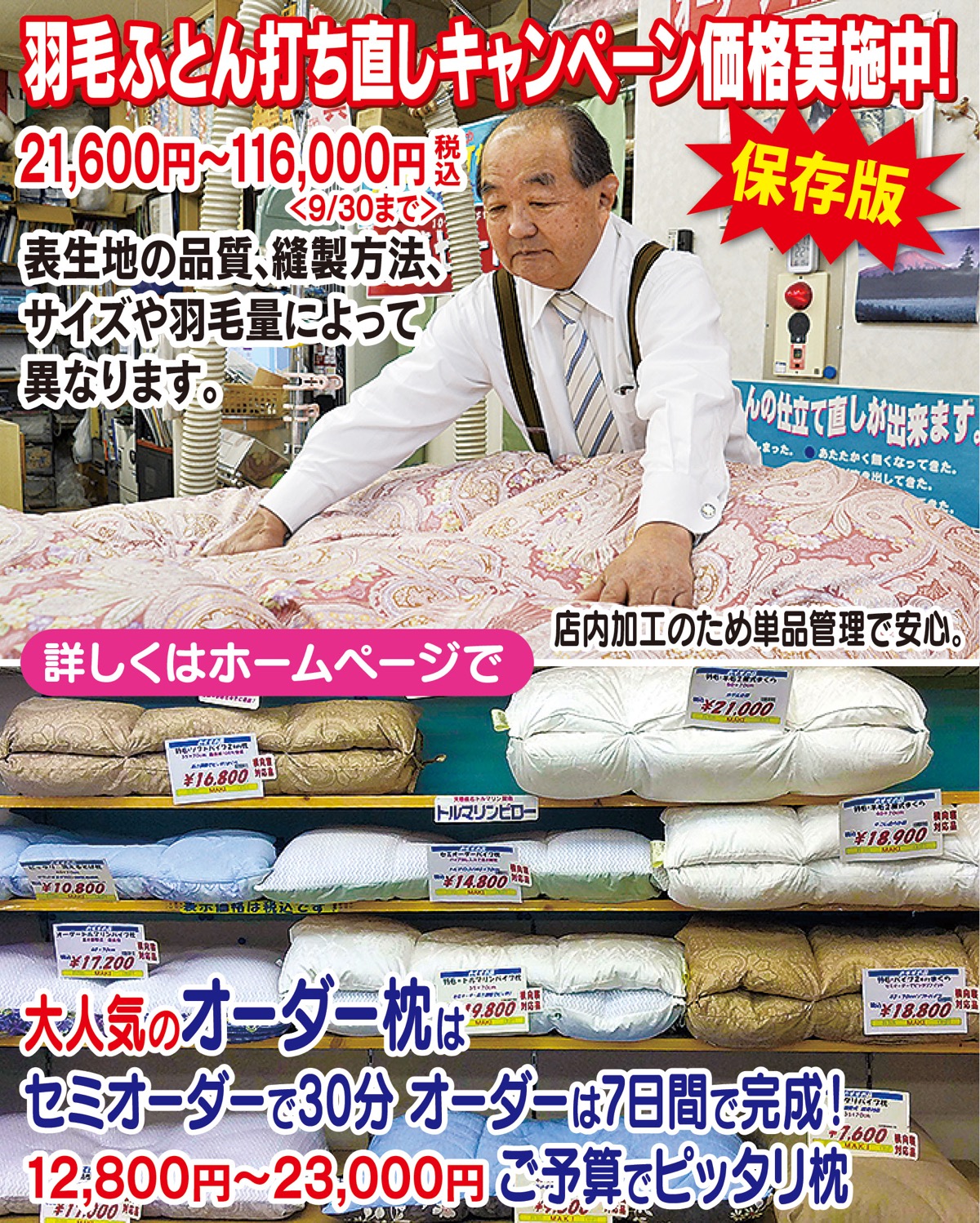 オーダーメイド打ち直しは『表生地・羽毛の品質、柄、縫製方法、羽毛量、サイズ変更等』が自由で長期間使える軽くて温かいふとんに変身。納期は1カ月程。木綿や羊毛ふとんの打ち直し、ふとん丸洗いも受付。