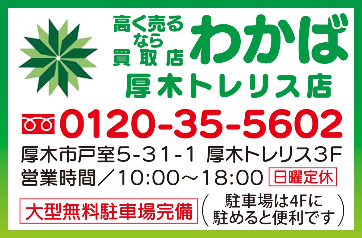 厚木トレリス3階の「買取店わかば」。今年で、開店4周年を迎える同店では、日ごろの感謝の気持ちを込め、カメラや貴金属、ブランドバッグなど、これまで以上に買い取りに力を入れるという。